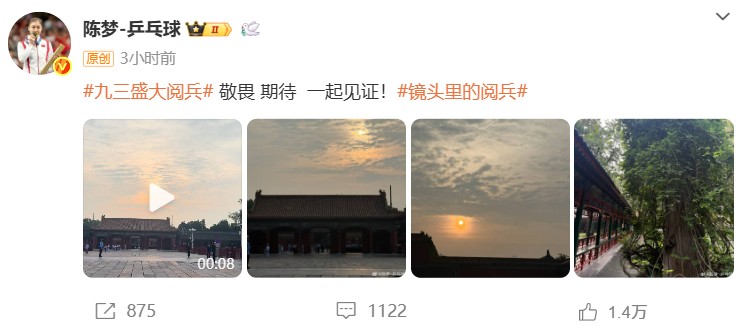 乒乓球运动员陈梦实时分享观礼感悟,“敬畏、期待,一起见证”。